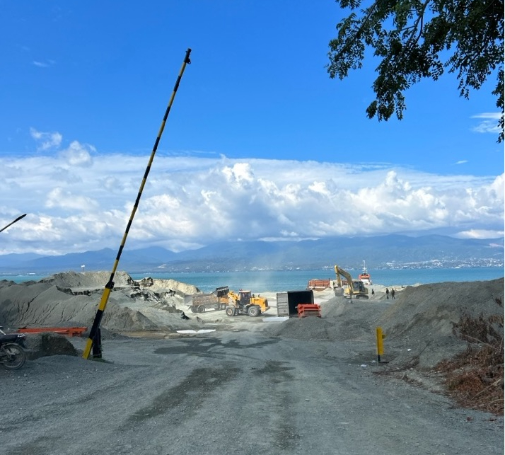 My extended stay in Palu witnessed a new extractive era for Central Sulawesi: similar rush, different commodities. One day we planned a trip to visit the famous Tanjung Karang beach in Donggala, a popular weekend getaway for Palu residents, an hour’s motorbike ride away. However, the entire coastline stretching from Palu to Donggala was blanketed with heavy dust. Trucks loaded with boulders or gravel hogged the highway. Mountains were stripped bare of vegetation. Unprepared with either mask or helmet visors, dirt engulfed us. Talk ceased. We struggled to seal our mouths and noses against the gritty air. The familiar taste of dirt instantly shifted me back to Morowali. It was the unmistakable taste of an extractive frontier. Producing dirt, eating dirt, and becoming dirt. All these limestone boulders were heading for barges that would take them to East Kalimantan, where work is continuing on the new national capital, Ibu Kota Nusantara (IKN).