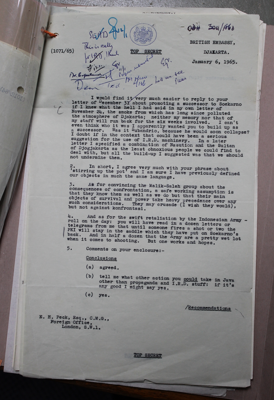 Some years later historian David Easter drew on declassified government files to add a great deal to our understanding of this propaganda system, or what British intelligence officer Norman Reddaway called the ‘bludgeon’. IRD received information on events inside Indonesia from British overseas missions, before selectively passing it along to international news agencies, newspapers and radio broadcasters publishing material in Indonesia. Although Easter lacked access to the resulting media itself, he has argued that discussion about its content recorded in the diplomatic files prove that ‘Britain incited hostility to the communists and at least implicitly encouraged the mass murder of thousands of people’.